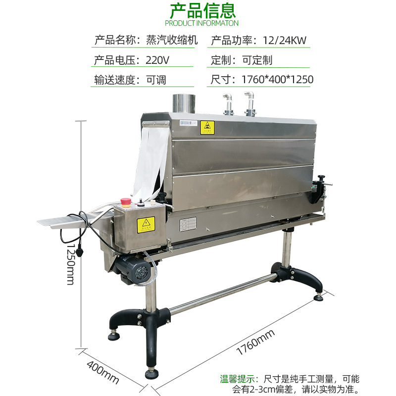 - 適用范圍廣:可以對各種形狀和尺寸的產品進行收縮包裝,只要產品的尺寸在收縮通道的設計范圍內。無論是規則形狀的產品,如長方體的盒子、圓柱體的瓶子,還是不規則形狀的產品,都可以通過調整蒸汽的參數和輸送帶的速度等方式,實現良好的收縮包裝。