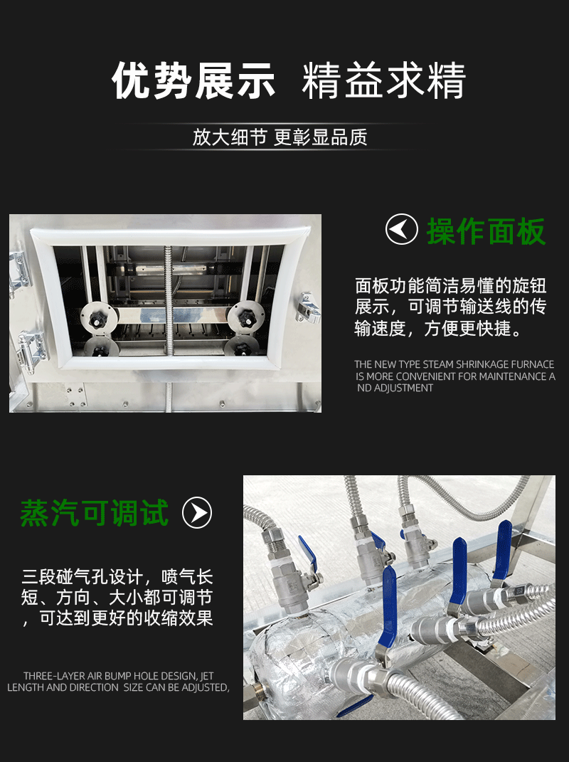 節能環保特點:通過精確的蒸汽控制和高效的隔熱措施,機器在保證良好收縮效果的同時,能夠有效節約能源。與一些傳統的包裝方式相比,蒸汽收縮包裝減少了包裝材料的浪費,并且蒸汽可以循環利用,降低了生產成本和對環境的影響。