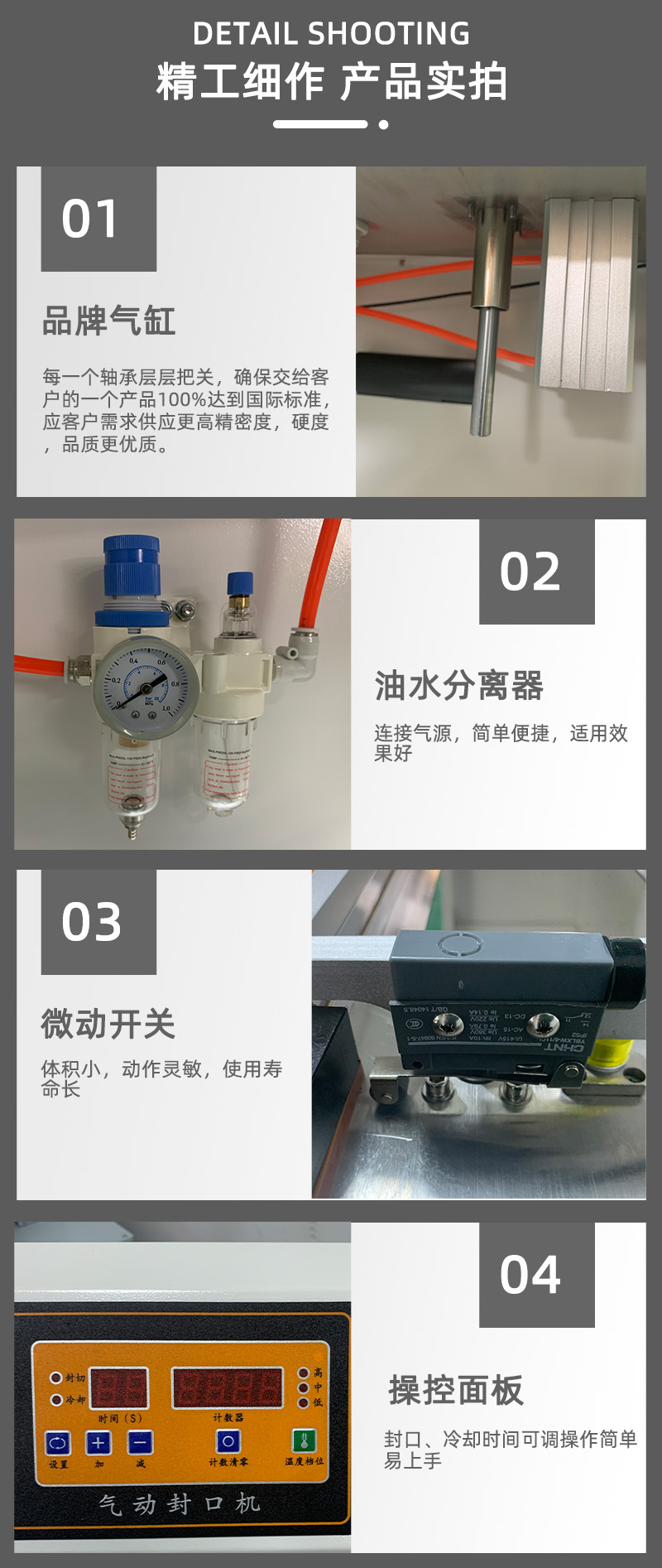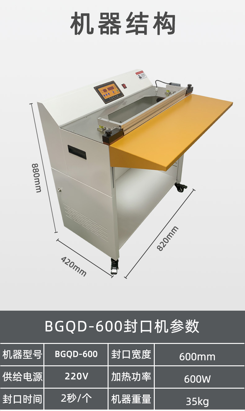 氣動(dòng)封口機(jī)采用氣動(dòng)驅(qū)動(dòng),氣缸的動(dòng)作速度較快,能夠在短時(shí)間內(nèi)完成封口操作,提高包裝效率