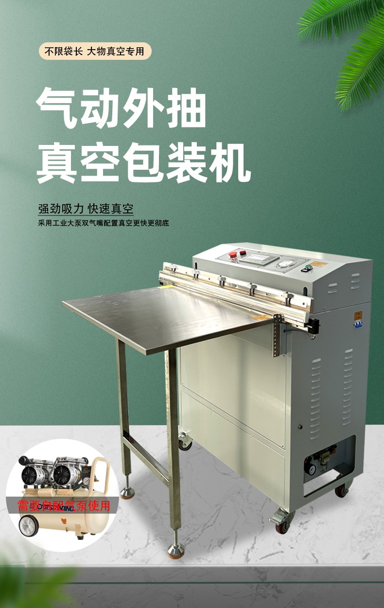 這種高效的包裝能力,使得它能夠充分滿足大規模生產需求。無論是食品企業大規模生產的休閑食品、肉制品,還是醫藥企業批量生產的藥品、保健品,亦或是電子企業大量制造的電子元件等產品的包裝工作,氣動外抽真空包裝機都能高效應對。它能快速完成海量產品的真空包裝,助力企業在單位時間內生產出更多成品,及時供應市場,提高企業在市場競爭中的供貨能力與市場占有率。
