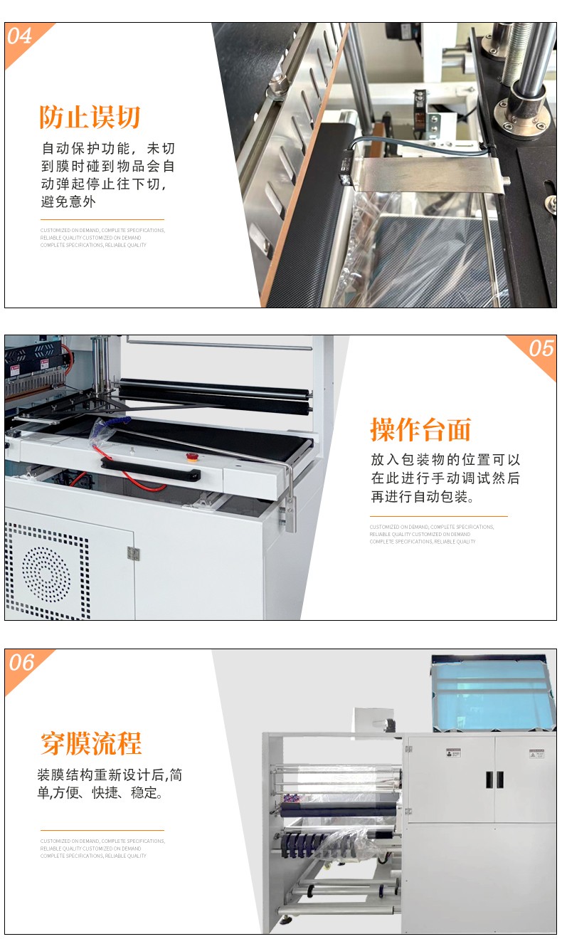 • 自動(dòng)化程度高:配備 PLC 控制系統(tǒng)和光電感應(yīng)裝置,可自動(dòng)完成送膜、封口、熱收縮、出料全流程,無(wú)需人工干預(yù)。