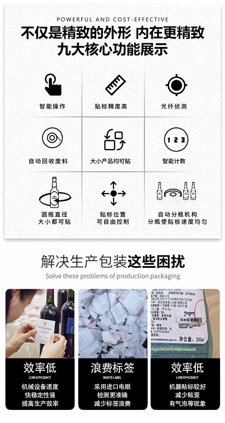 替代人工,降本提質:避免人工貼標歪斜、起泡、效率低等問題,穩定貼標質量,降低單位成本,提升產品包裝美觀度與競爭力。