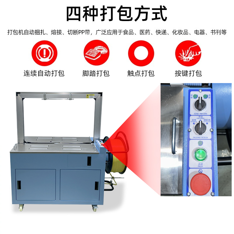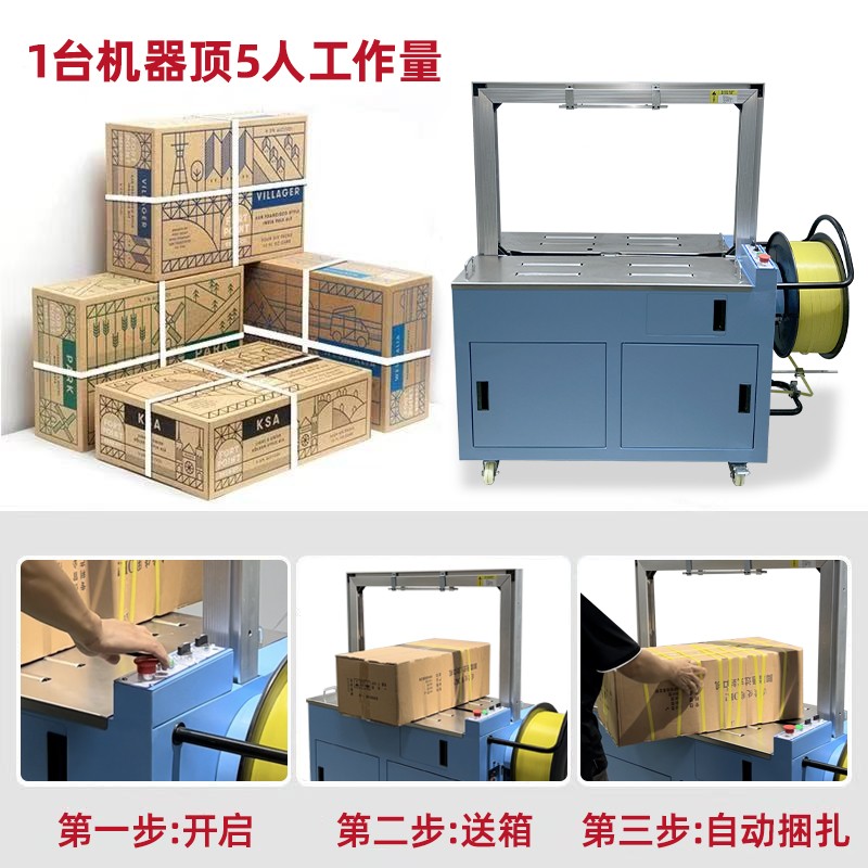 • 半自動打包機:需要人工參與部分環節,通常是人工將打包帶繞過物品,放置在打包機的特定位置,然后啟動機器,由機器完成收緊、封口和切斷等操作。