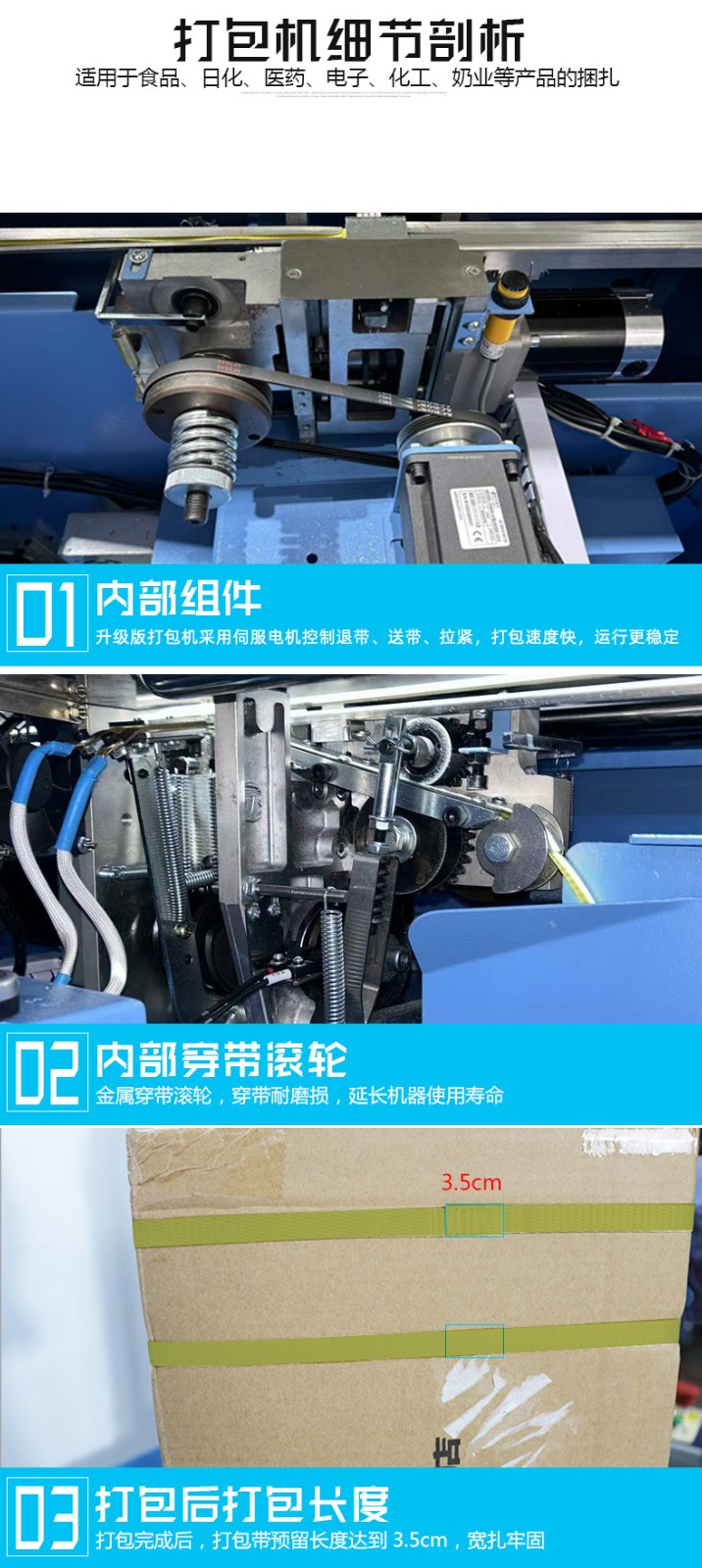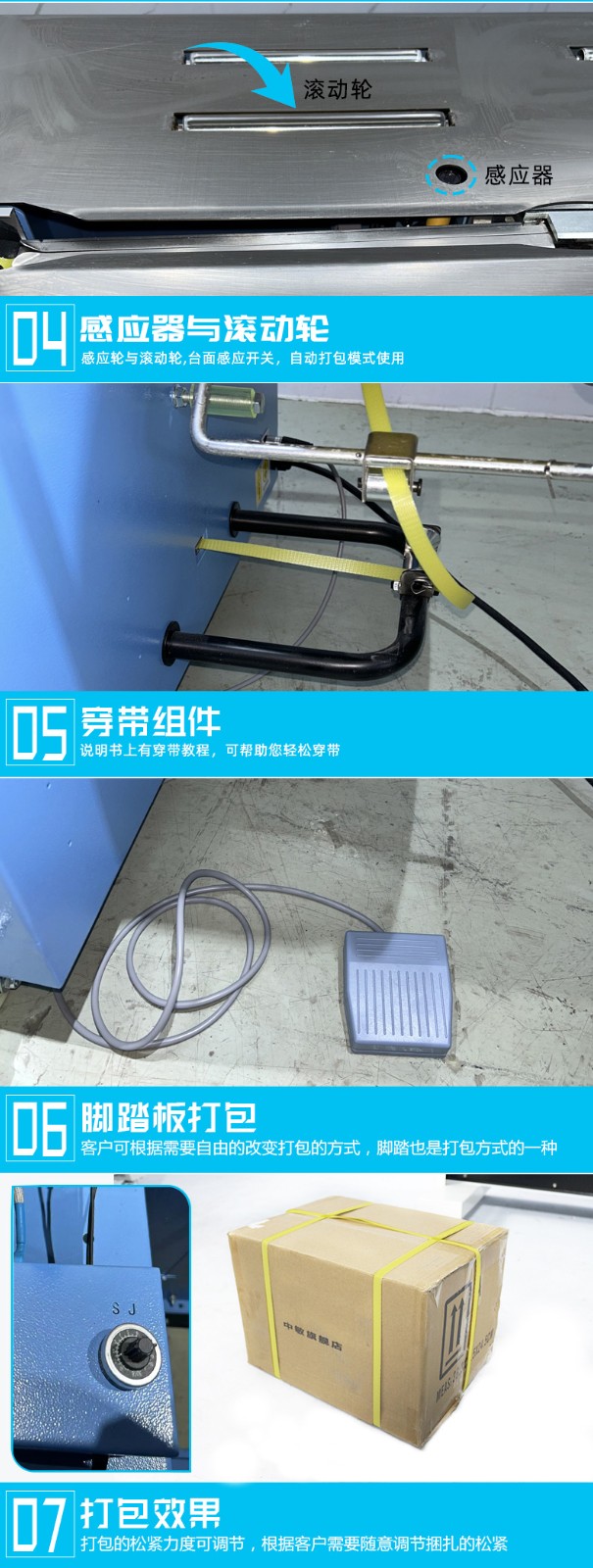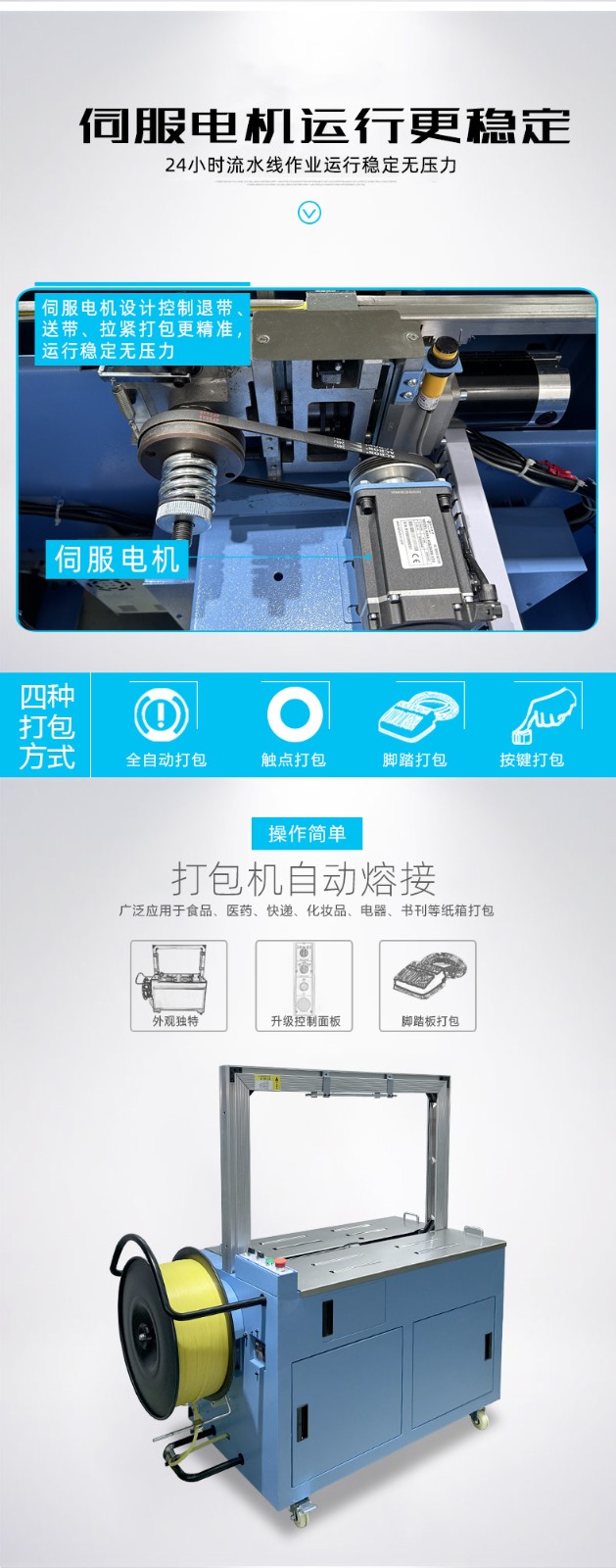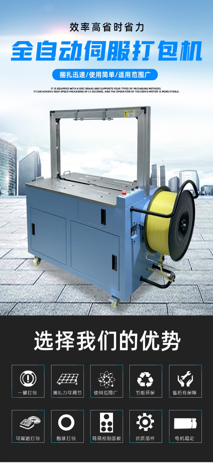 • 全自動打包機:自動化程度高,能自動完成送帶、捆扎、收緊、封口、切斷等一系列打包流程,只需將物品放置在指定位置,按下啟動按鈕,機器就會按照預設程序完成整個打包過程,無需人工干預每個步驟。