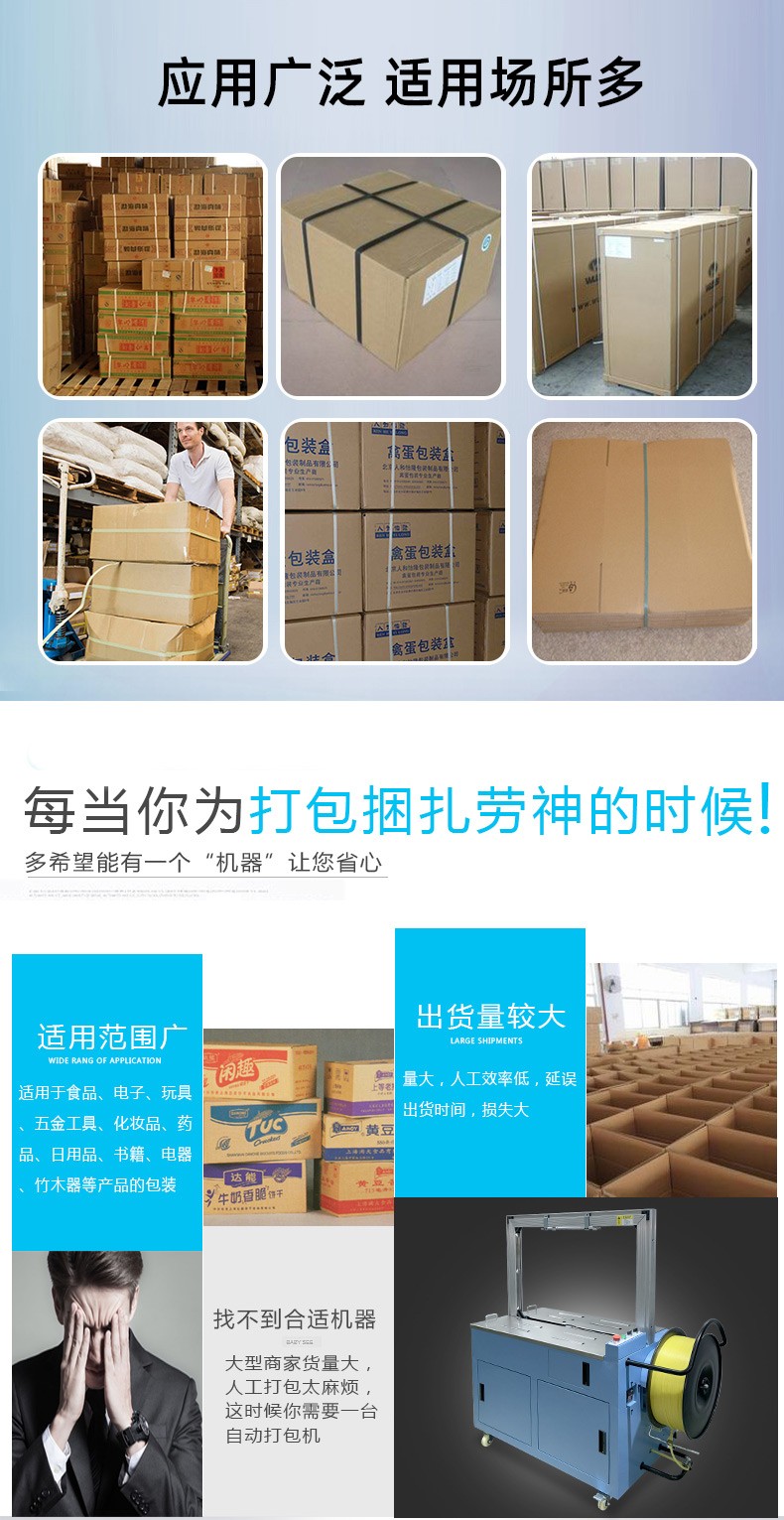• 全自動打包機:工作效率高,由于無需人工頻繁操作,連續打包能力強,每分鐘可完成多個物品的打包,適用于大規模、高頻率的打包作業,如大型物流中心、生產車間等。
