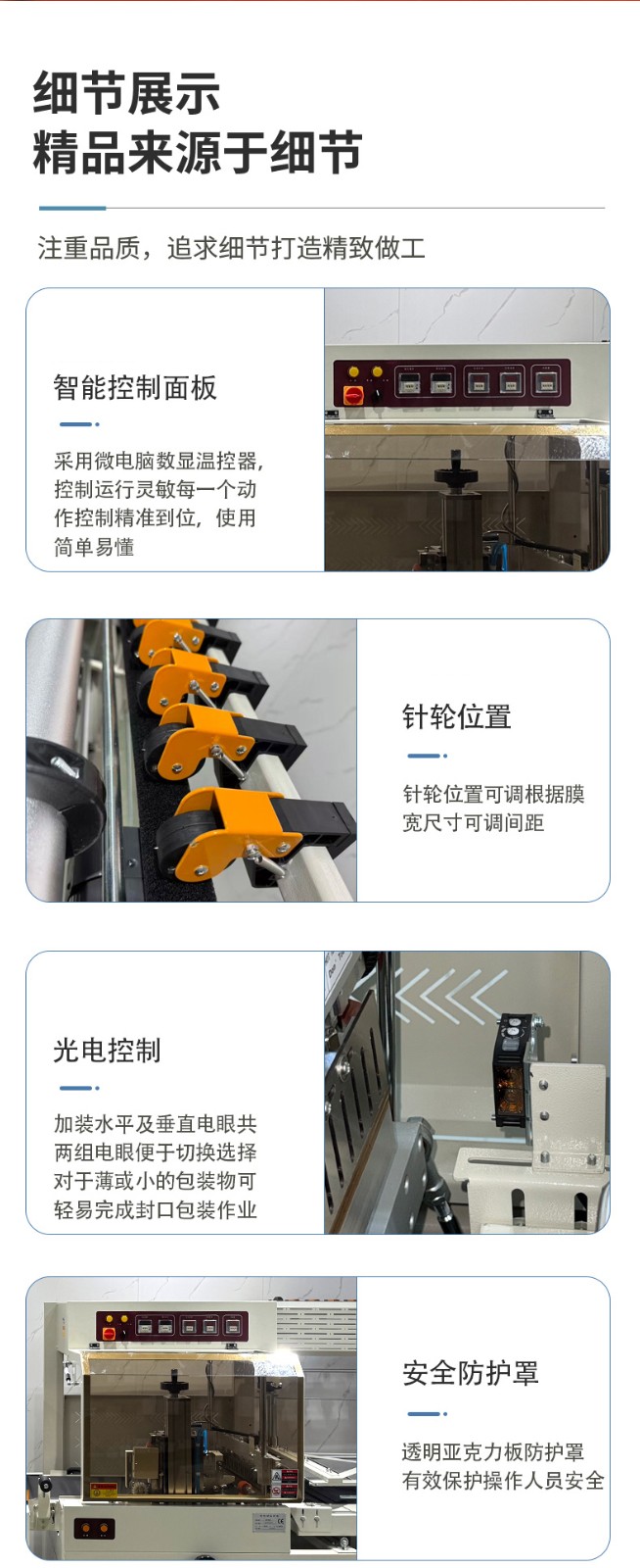 全自動邊封熱收縮機的控制系統是整個設備的 “大腦”,它負責協調和控制各個部件的運行,以實現高效、精準的包裝過程。以下是對其控制系統的詳細介紹: 硬件組成 PLC 控制器 核心運算與控制:PLC(可編程邏輯控制器)是控制系統的核心部件。它接收來自各個傳感器的信號,如產品到位傳感器、薄膜檢測傳感器等,根據預設的程序進行邏輯運算和處理,并向各個執行元件發送控制指令,如驅動電機、氣動元件等,以精確控制送料、套膜、封切和熱收縮等各個包裝工序的執行順序和時間。 穩定性與可靠性:具有高可靠性,能在惡劣的工業環境下穩定工作,抗干擾能力強,可確保設備長時間連續運行而不出現故障,保證包裝過程的穩定性和一致性。 觸摸屏 人機交互界面:觸摸屏作為人機交互的窗口,為操作人員提供了直觀、便捷的操作平臺。操作人員可以通過觸摸屏幕輕松設置各種包裝參數,如封切時間、收縮溫度、輸送速度等。同時,觸摸屏還能實時顯示設備的運行狀態,如當前工作模式、各部件的運行參數、故障報警信息等,方便操作人員隨時了解設備運行情況并及時進行調整和維護。 參數設置與存儲:支持多種參數的設置和存儲,可根據不同的產品包裝需求,預設多個包裝方案,操作人員只需在觸摸屏上選擇相應的方案,即可快速切換設備的工作參數,無需重新逐一設置,大大提高了工作效率。此外,觸摸屏還具備密碼保護功能,可防止非授權人員隨意修改參數,確保設備運行的安全性和穩定性。 軟件功能 參數設置與調整功能 精確控制:通過控制系統的軟件,能夠精確設置和調整封切時間、收縮溫度、輸送速度等關鍵參數。例如,封切時間可以精確到毫秒級,收縮溫度可在一定范圍內以較小的溫度梯度進行調整,輸送速度也能根據產品尺寸和包裝要求進行精確設定,從而保證不同產品都能獲得理想的包裝效果。 自動調節與優化:部分先進的控制系統還具備自動調節功能,能夠根據預設的包裝質量標準,自動對參數進行微調優化。例如,在熱收縮過程中,系統可根據熱收縮膜的收縮情況,自動調整加熱溫度和風機風速,以確保熱收縮膜均勻收縮,緊密貼合產品表面。 運行監控與故障診斷功能 實時監控:控制系統實時監控設備各個部件的運行狀態,包括電機的轉速、加熱元件的溫度、氣動元件的壓力等。通過傳感器將這些實時數據反饋給 PLC 控制器,再由觸摸屏以圖形化界面的形式展示給操作人員,使操作人員能夠直觀地了解設備的運行情況。 故障診斷與報警:一旦檢測到設備出現異常情況,如溫度過高、電機過載、薄膜供應不足等,控制系統會立即進行故障診斷,并在觸摸屏上顯示詳細的故障信息和報警提示。同時,系統還會自動記錄故障發生的時間、位置和相關參數,以便維修人員快速定位和排除故障。有些控制系統還具備遠程監控和報警功能,可通過網絡將故障信息發送給相關人員的手機或電腦,實現及時響應和處理。 生產數據統計與管理功能 數據統計:控制系統能夠自動統計生產過程中的各種數據,如包裝數量、生產速度、設備運行時間、故障停機時間等。這些數據對于企業的生產管理和質量控制具有重要意義,可幫助企業分析生產效率、評估設備性能、制定生產計劃和進行成本核算。 數據存儲與查詢:生產數據可存儲在控制系統的內存或外部存儲設備中,方便操作人員隨時查詢和調用。同時,數據還可通過網絡接口導出到計算機或企業的生產管理系統中,以便進行進一步的分析和處理,為企業的決策提供數據支持。 通信與聯網功能 內部通信:控制系統通過內部通信總線實現各個硬件模塊之間的高速數據傳輸和通信,確保 PLC 控制器、觸摸屏、傳感器和執行元件等之間的信息交互準確、及時,從而實現設備各部件的協同工作。 外部聯網:一些高端的全自動邊封熱收縮機控制系統支持外部聯網功能,可通過以太網、WiFi 等方式與企業的生產管理系統或其他設備進行聯網通信。這樣,企業可以實現對多臺設備的集中監控和管理,優化生產流程,提高生產效率和管理水平。例如,在一個大規模的包裝生產線上,通過聯網功能可以將多臺熱收縮機與前端的灌裝設備、后端的貼標設備等進行整合,實現整個包裝生產線的自動化和智能化控制