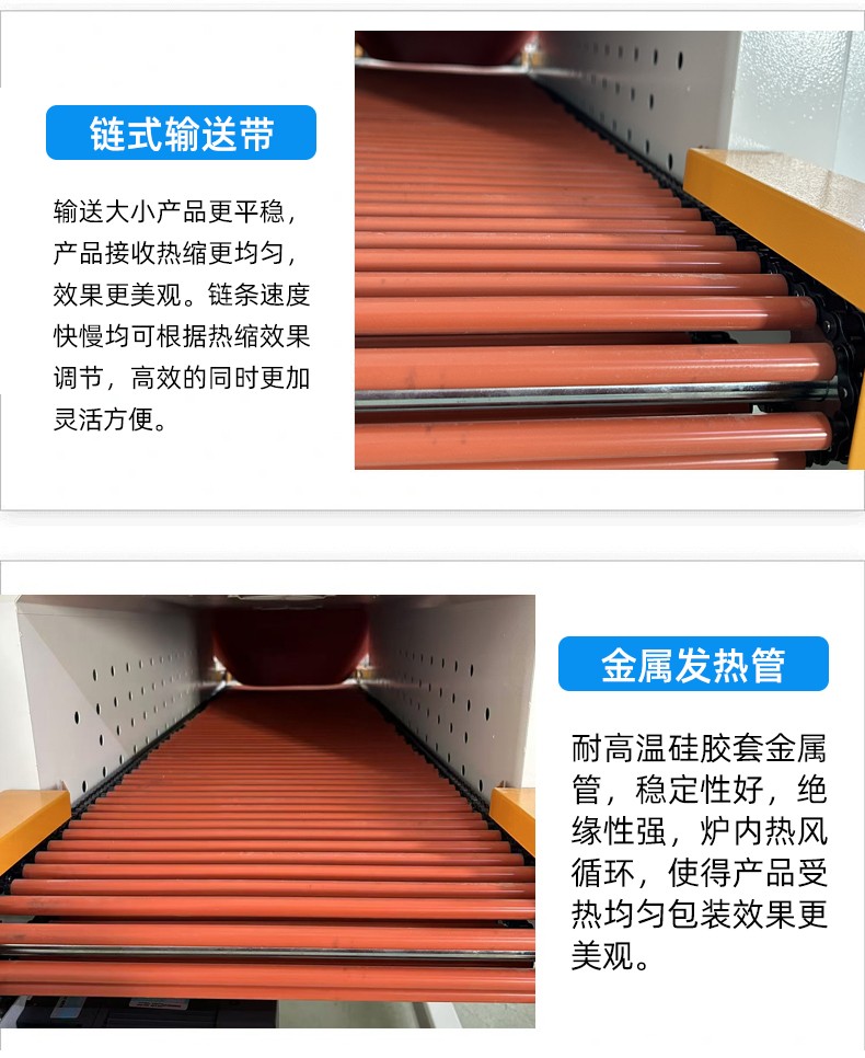 - 熱收縮效果佳:熱收縮通道內(nèi)的溫度分布均勻,熱風循環(huán)系統(tǒng)設計合理,可使塑料薄膜均勻收縮,緊密貼合產(chǎn)品,展現(xiàn)產(chǎn)品的外觀特征,同時起到防潮、防塵、防碰撞等保護作用。