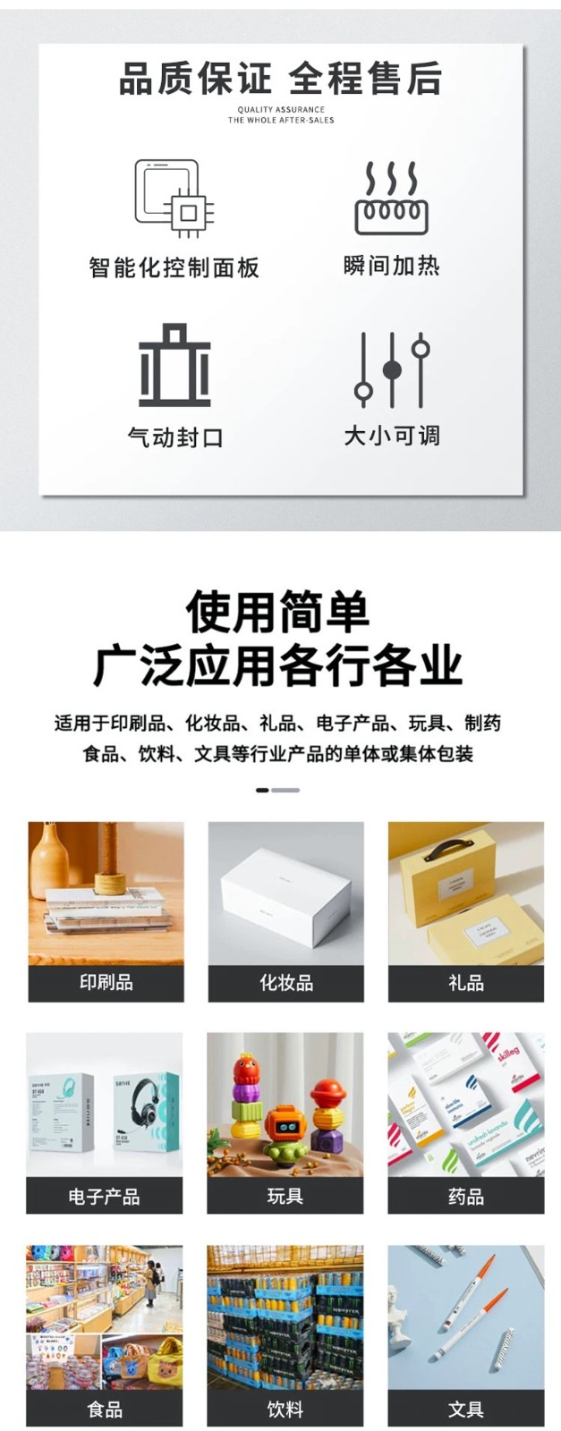 - 電子行業(yè):電子元器件、小型電子產(chǎn)品如手機、耳機、充電器等,需要防潮、防靜電的包裝環(huán)境。該設備可使用防靜電塑料薄膜對電子產(chǎn)品進行包裝,在保護產(chǎn)品的同時,提供良好的外觀展示