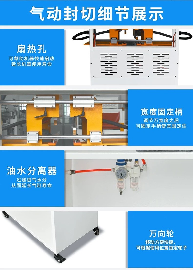 - 封口質量好:通過精確控制氣動壓力和加熱溫度、時間,能夠保證封口處的薄膜熔接牢固、平整,封口強度高,不易出現(xiàn)漏包現(xiàn)象。