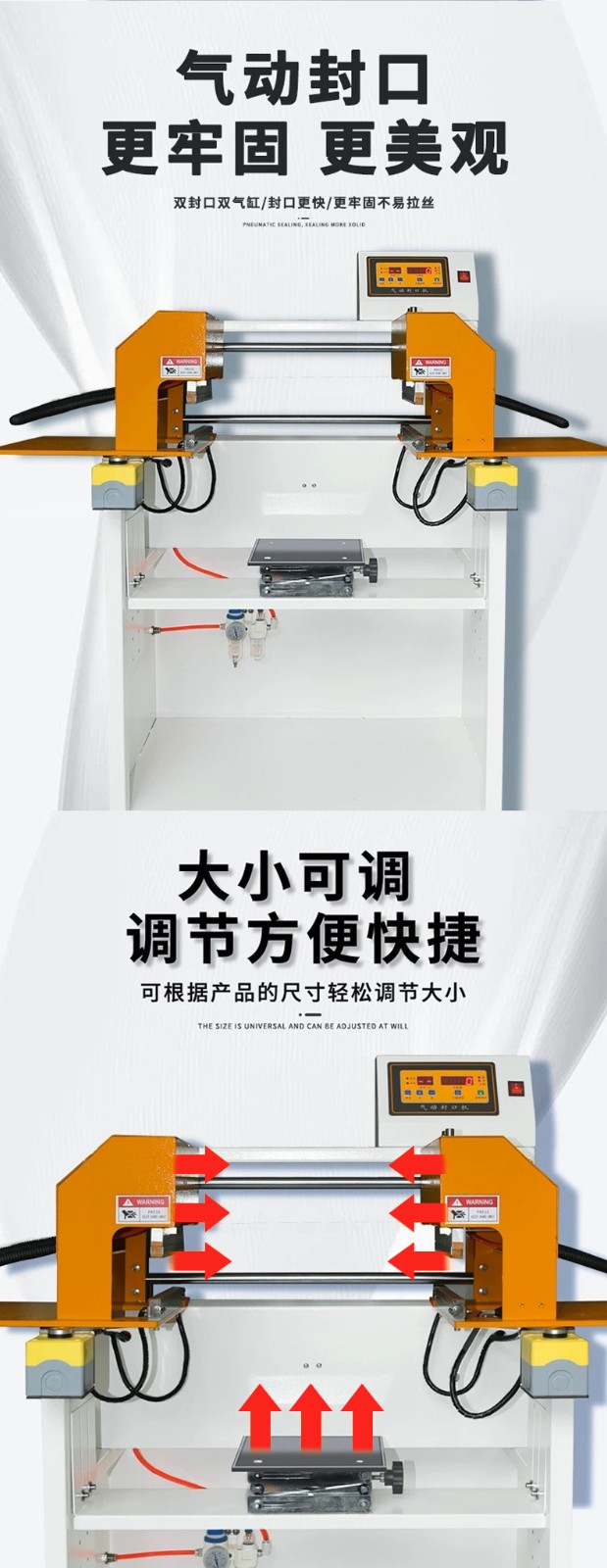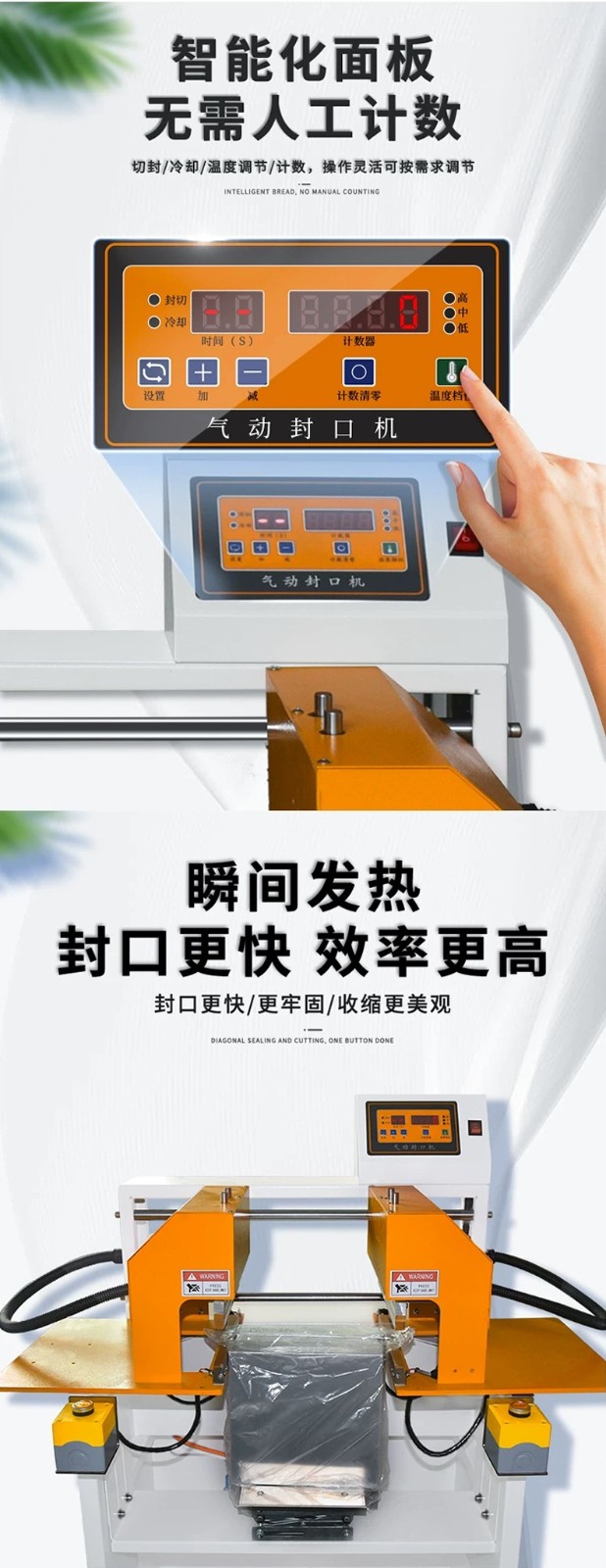 - 封口原理:通過氣動裝置產(chǎn)生壓力,將待包裝物品的塑料薄膜袋口部位壓緊,然后利用加熱元件對袋口進行加熱,使薄膜受熱熔化,在壓力作用下實現(xiàn)封口。