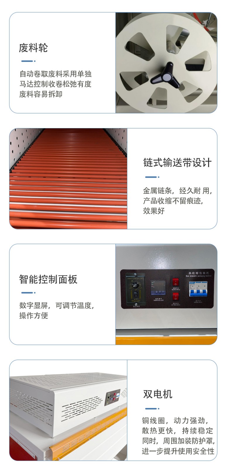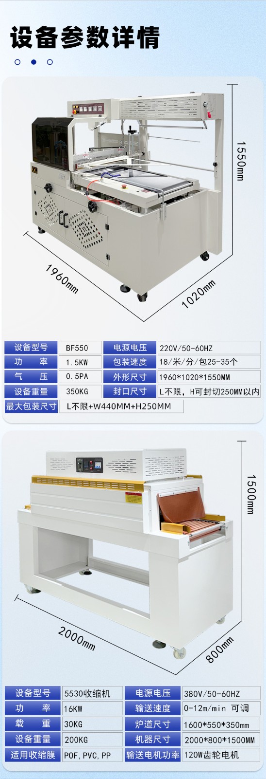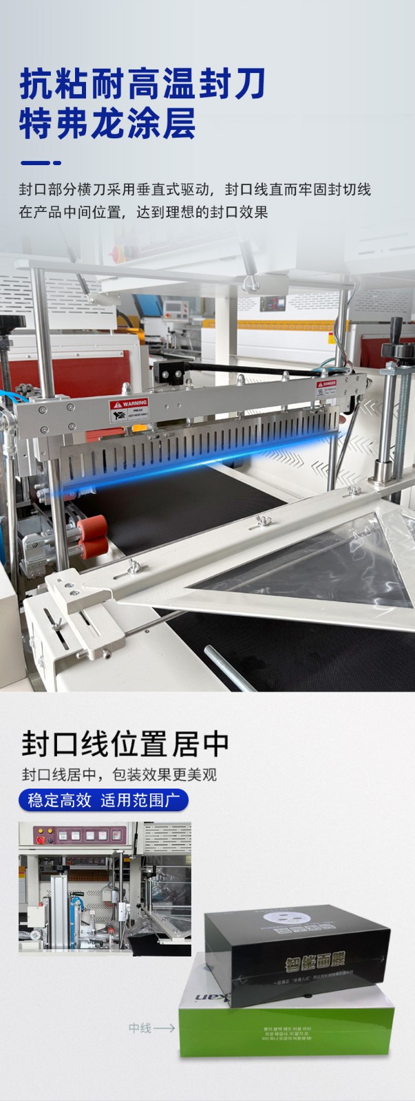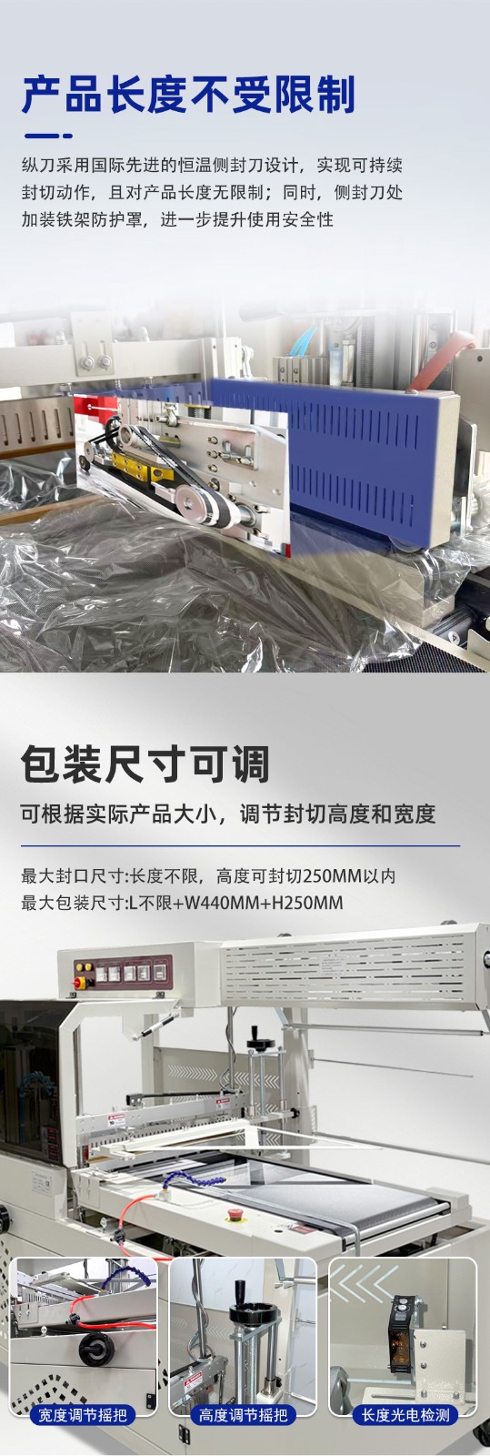 • 適用范圍廣4:邊封設(shè)計(jì)的包裝機(jī)可包裝長(zhǎng)度不限的產(chǎn)品,通過調(diào)整還能適應(yīng)不同寬度、高度的產(chǎn)品包裝,可用于 POF、PVC 等多種熱收縮膜,能滿足食品、電子、醫(yī)藥、日化等多個(gè)行業(yè)的包裝需求。
